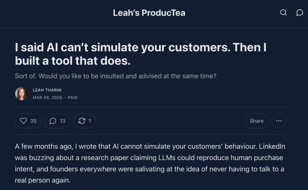 Leah Tharin, especialista em product-led growth com mais de vinte anos em gestão de produto e atual Head of Product na Jua.ai, escreveu na sua newsletter ProducTea, no Substack, que inteligência artificial não consegue simular o comportamento de clientes.